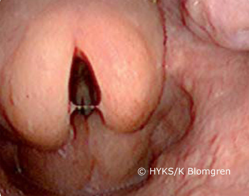 Epiglottitis. In acute epiglottitis, the swollen epiglottis is pressed over the vocal cords thus causing difficulty breathing. In this picture also the mucosal membrane over the arytenoid cartilages is swollen.