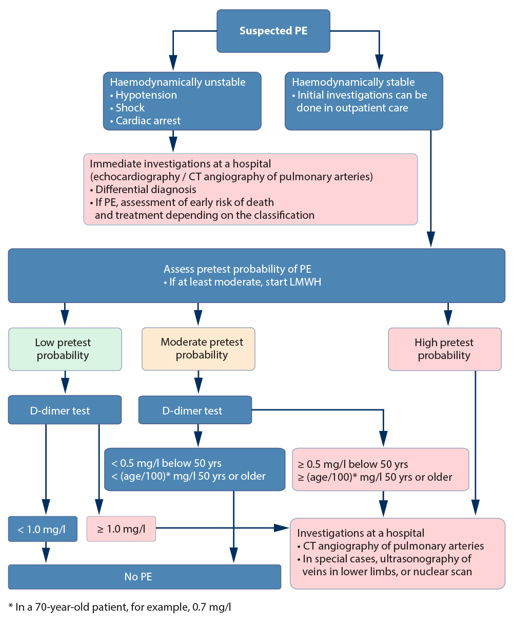 Diagnosis of pulmonary embolism. Haemodynamically unstable patients should be sent to hospital immediately by ambulance. In haemodynamically stable patients, the pretest probability of pulmonary embolism should be assessed Pulmonary Embolism. Any further examinations should be chosen based on the pretest probability.
