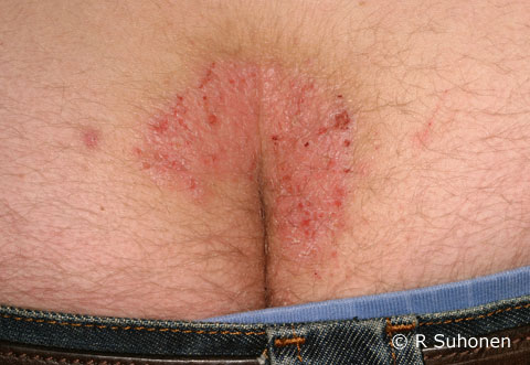 Neurodermatitis in the gluteal cleft. Neurodermatitis, i.e. a lichenified ill-defined eczematous patch in the upper part of the gluteal cleft, as the result of a vicious circle of itching and scratching. The skin is broken from scratching. The eruption resembles lichen planus: check the skin in other parts of the body (especially wrists, ankles and oral mucosa).