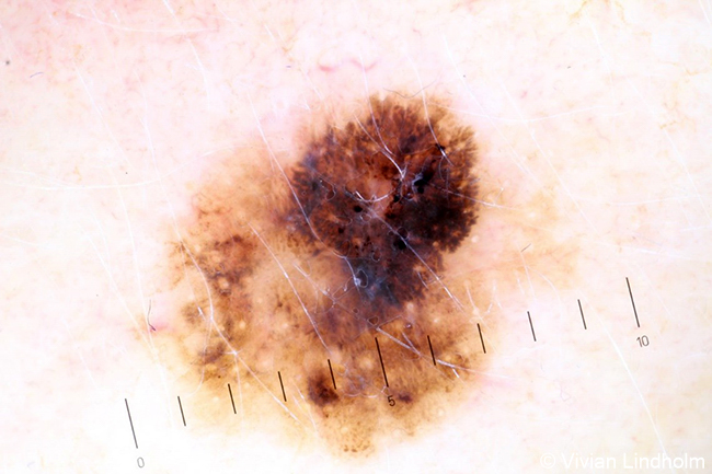 Lentigo maligna melanoma. Dermatoscopic image. Breslow classification 0.6 mm. The lesion is asymmetric in its overall and pigment structure. In addition, there are some blue-white veil and black dots that are asymmetrically distributed. Follicular openings are partly covered and surrounded by pigment in an annular-granular pattern, as is often the case with lentigo maligna melanoma.