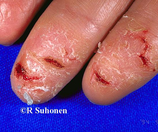 Finger tip dermatitis. Finger tip dermatitis is common in housewives with atopic background and contant exposure to water and detergents. This clinical picture is quite resistant to therapy, which should combine potent topical corticosteroid to regular use of emollients and protection of the skin against irritants.