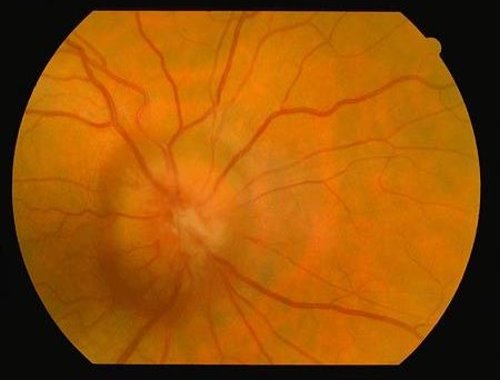 Papilloedema caused by high intracranial pressure. Papilloedema: the central pit has disappeared, the optic disk is oedematous and it has hazy borders. The condition is bilateral, and the visual acquity is normal. The patient has increased intracranial pressure.