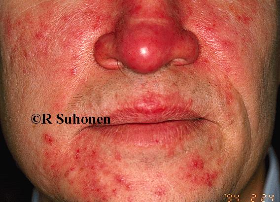 Rosacea. Rosacea affects both men and women and appears as erythematous papules. Exposure to sun and taking a sauna make it worse.