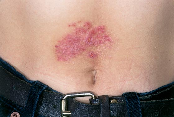 Nickel allergy on the waist. Eczematous patch of nickel allergy in the umbilical region at a typical location. It is caused by the belt buckle.