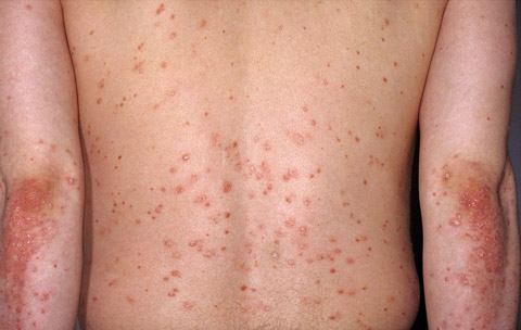 Guttate psoriasis. Guttate psoriasis usually erupts after an infection (streptococcal tonsillitis).