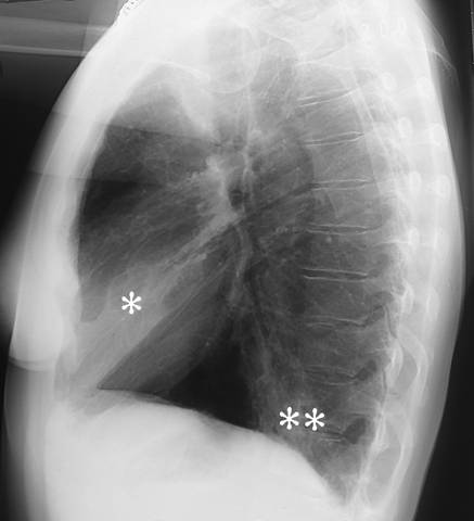 Lobar pneumonia (lateral view). Lobar pneumonia. The lateral radiograph shows alveolar consolidation both in the middle lobe (*) and in the inferior lobe (**) of the right lung. For PA view: see Lobar Pneumonia (Pa View).