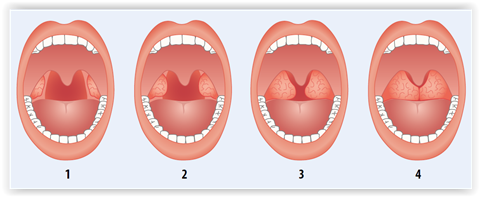 Classification of the size of palatine tonsils. An example of a classification for the size of palatine tonsils. Grade 1. Palatine tonsils hidden between the anterior and posterior palatine arches. Grade 2. Palatine tonsils reaching the level of the palatine arches. Grade 3. Palatine tonsils hiding the posterior palatine arches from view. Grade 4. Palatine tonsils meeting in the midline (kissing tonsils').