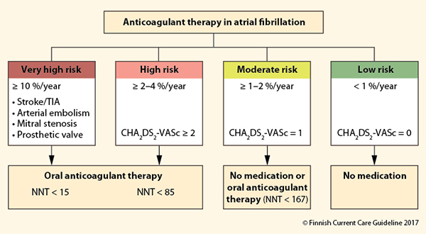The justification of anticoagulant therapy is assessed in relation to the patient's individual risk of stroke using the (modified1 ) CHA2DS2-VASc risk score. In high-risk patients (CHA2DS2-VASc HASH(0x2fd57c0) 2), anticoagulant therapy (direct anticoagulant or warfarin) is indicated almost without exception. In patients with moderate risk (CHA2DS2-VASc = 1), the need for anticoagulation is assessed individually. Anticoagulation may be omitted, if the bleeding risk is high, the patient does not want to use anticoagulant therapy, the risk factor (e.g. hypertension) is well managed and the patient does not have other, smaller risk factors (e.g. smoking, dyslipidaemia, renal failure). Anticoagulation therapy is not given to low-risk patients (CHA2DS2-VASc = 0), since in such patients its adverse effects exceed its benefits. ASA and ADP receptor antagonists are not suitable for the prevention of thrombosis associated with atrial fibrillation, due to their poor efficacy and adverse effects. The NNT (number needed to treat) indicates the number of patients that need to be treated so that one of them avoids stroke during one year, compared with those using placebo. If needed, the anticoagulation therapy may be temporarily discontinued during such procedures or surgery that entail bleeding risk, with the exception of highest-risk patients.