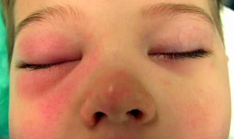 Preseptal cellulitis of the right eye in a child. Marked swelling of the eyelids on the right side indicating preseptal cellulitis, i.e. inflammation of the connective tissue of the eyelids, associated with sinusitis.