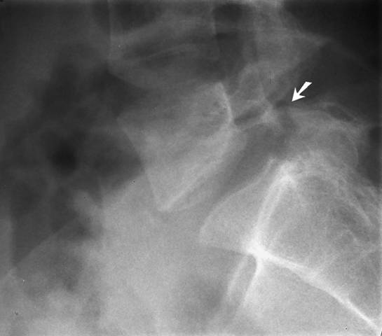 Spondylolysis and spondylolisthesis of the L5 vertebra. Spondylolysis (arrow) and mild spondylolisthesis of the L5 vertebra