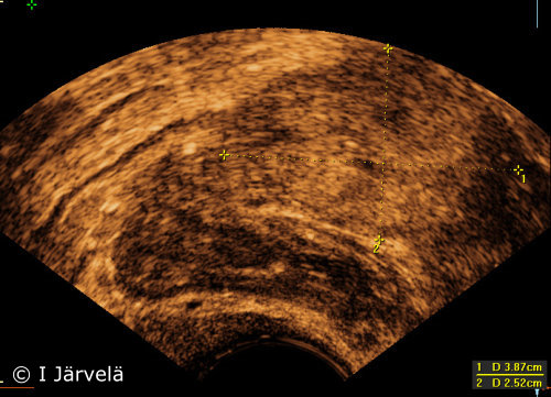 Ectopic pregnancy (ultrasound scan). Ectopic pregnancy (measured) at the side of the ovary.