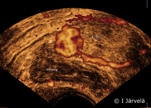 Ectopic pregnancy (ultrasound scan). Ectopic pregnancy and the ovary in a Doppler ultrasound scan.