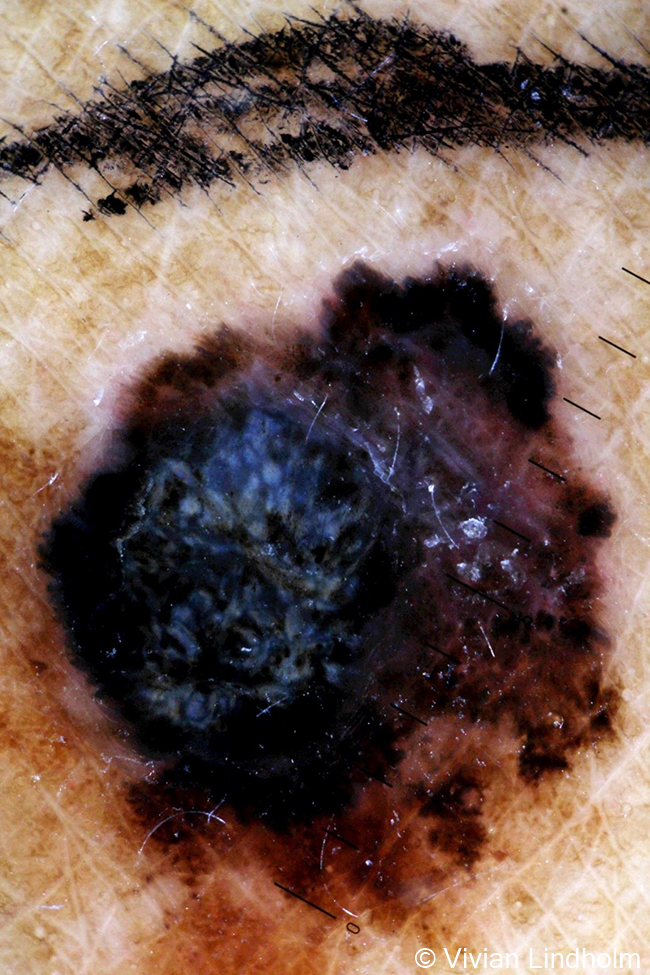 Melanoma. Dermatoscopic image. (Breslow 1.3 mm, Clark IV), note the blue-white veil in the centre; in addition, the pigment network is asymmetric and partly indiscernible (structureless black areas). At the lesion margins (particularly in the upper parts), there is asymmetrically distributed radial streaming.