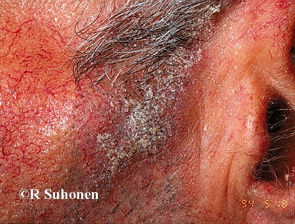 Seborrhoeic dermatitis on the preauricular hairy skin (sideburns). In seborrhoeic dermatitis, the scales are more fine-grained than in psoriasis.