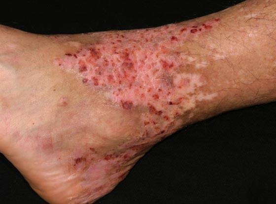 Neurodermatitis on the leg. Neurodermatitis, i.e. lichen simplex chronicus, may resemble psoriasis or lichen ruber planus. Neurodermatitis, however, usually appears as a single itchy patch on a limb or the neck.