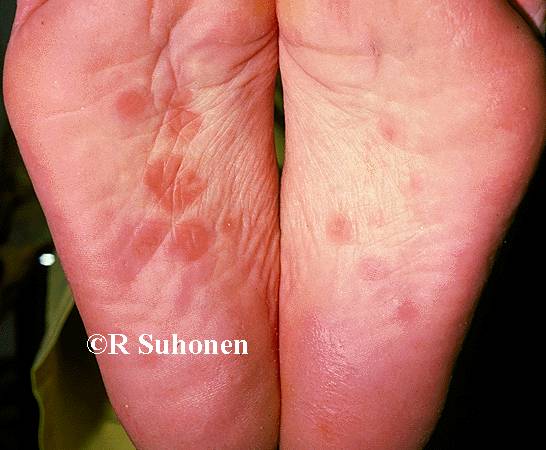 Signs of secondary syphilis on the soles. This type of macular, red-brownish patches on the soles are characteristic of secondary syphilis. See a picture of the palm of the same patient Signs of Secondary Syphilis on the Palm. Determining Treponema pallidum antibodies is the primary screening test.