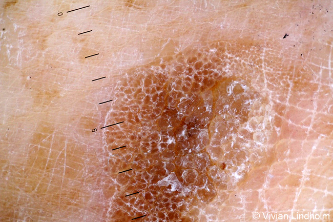 Seborrhoeic keratosis (seborrhoeic wart). Dermatoscopic image. In this case, there is a papillomatous furrow-ridge (sulcus-gyrus) structure.