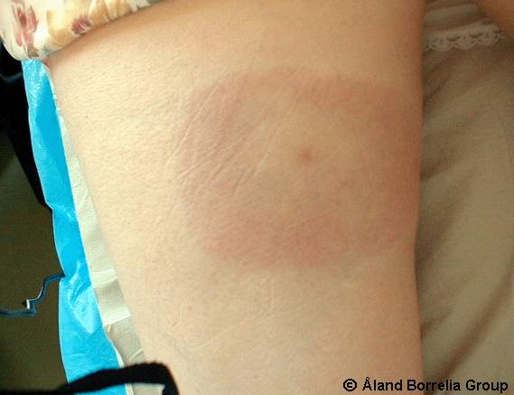 Erythema migrans. The patient noticed the erythema migrans lesion (9 x 14 cm) in his left thigh 3 days before the picture was taken. The patient did not remember a tick bite. Note the pale central area around the bite. Borreliosis (B. afzelii) was verified (for research purposes) by culture from a biopsy taken from the lesion.