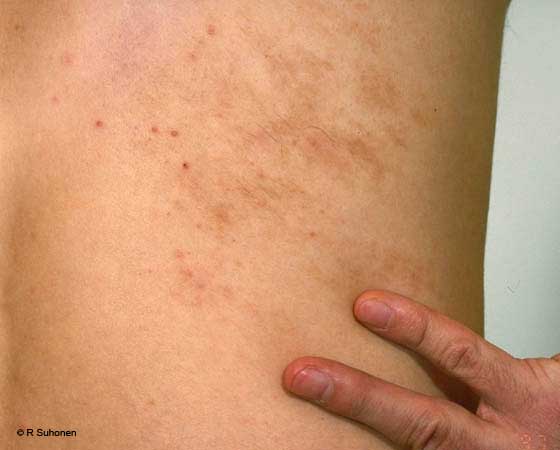 Becker's melanosis on the back. An irregular pigmented area, often more hairy than the surrounding skin, is not uncommon: Becker's melanosis (Melanosis naeviformis Becker-Siemens). There is neither any need nor a good method for treatment. In typical cases not even a biopsy is indicated. The main differential diagnosis is pityriasis versicolor.