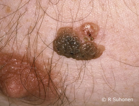 Seborrhoeic keratosis on the chest. Seborrhoeic keratosis (seborrhoeic wart) in the skin of the chest. The lesion is wart-like and crumbling and the surface feels a bit greasy. Seborrhoeic warts are sometimes itchy and may become irritated from scratching. If wanted, the lesion can be removed by curettage (video Curettage of Seborrhoeic Keratosis) or liquid nitrogen cryotherapy. Curettage yield can be used for histopathologic examination if the diagnosis is unclear.