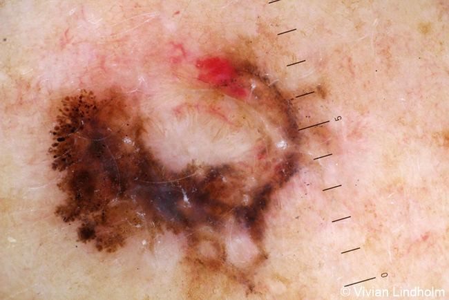 Melanoma. Dermatoscopic image. Breslow classification 0.6 mm. In this lesion, there are marginal structures typical for melanoma, and pseudopods and black dots at the left margin. In addition, there is an area of regression at the centre of the lesion. The lesion is asymmetric, and there are many different colours and some atypical pigment network.