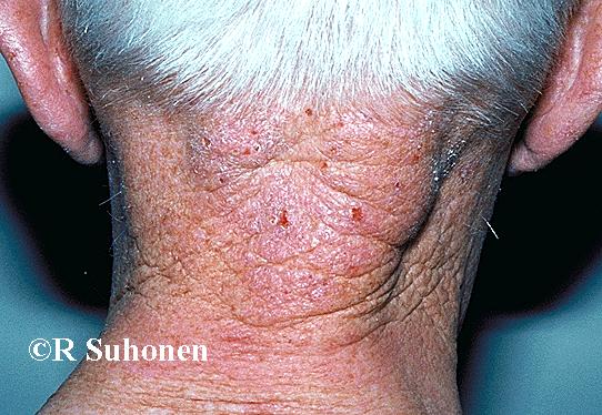 Neurodermatitis nuchae.Lichenification of the skin, a few excoriations and generally elastotic skin of the neck ("farmer's neck", "sailor's neck", cutis rhomboidalis nuchae).