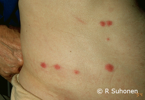 Insect bite reaction.Bites of a flea or mite. Bites of Cheyletiella mites (from dogs or cats) or of bird fleas usually occur as groups of a few itchy red papules, in areas covered by clothes. Insects are not found from the skin. The symptoms require that a person is sensitized to the causative parasite, and hence Cheyletiella of a family dog may cause symptoms only in some family members. The source of the parasite (pets) should be desinfected.