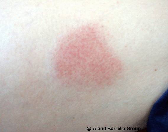 Erythema migrans. The tick bite occurred 14 days before the picture was taken. The patch (7 x 7 cm) has no pale central area any more, and it bears some resemblance to nummular eczema. Borreliosis (B. garinii) was verified (for research purposes) by culture from a biopsy taken from the lesion.