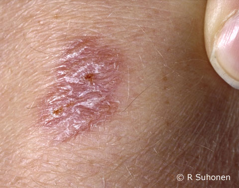 Scar sarcoidosis. In scar sarcoidosis, an old scar starts to thicken and purple-coloured nodules appear in it. Biopsy reveals granulomatous inflammation suggesting sarcoidosis. All patients, however, do not have sarcoidosis findings in the chest x-ray or elsewhere.