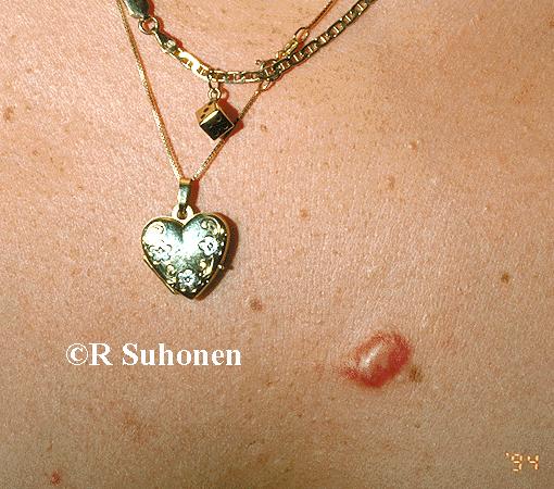 Keloid in a surgical scar. A small naevus was removed from the presternal region and a larger keloid replaced it. A simple excision of the keloid would be medical malpractice since an even larger scar would replace it. Silicone gel sheeting or liquid nitrogen therapy are relatively good treatment alternatives.