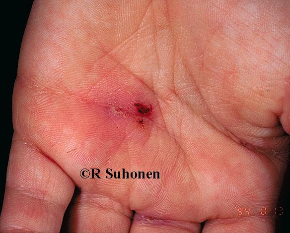 Scabies' furrows. Scabies' furrows are rather regularly found in the palmar skin, especially in children. The Sarcoptes scabiei -mite can be found on microscopic inspection.