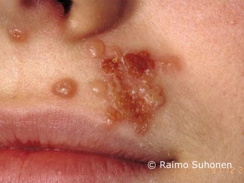 Recurrent Herpes simplex in the face.Recurring herpes is always milder than the primary infection. However, the severity of symptoms varies individually. The (recurrent) condition presented in the picture cannot yet be classified as eczema herpeticum.