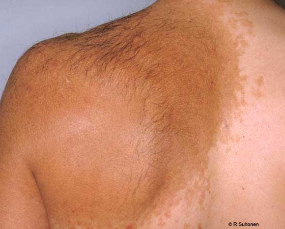 Becker's naevus with increased hair growth. Becker's naevus (melanosis naeviformis Becker-Siemens) resembles pityriasis versicolor. The patch does not scale at all (when scraped), the periphery is "archipelago-like", and boys usually have a higher than usual hair growth in the patch area. See also pictures Becker's Melanosis on the Back and Becker's Naevus.