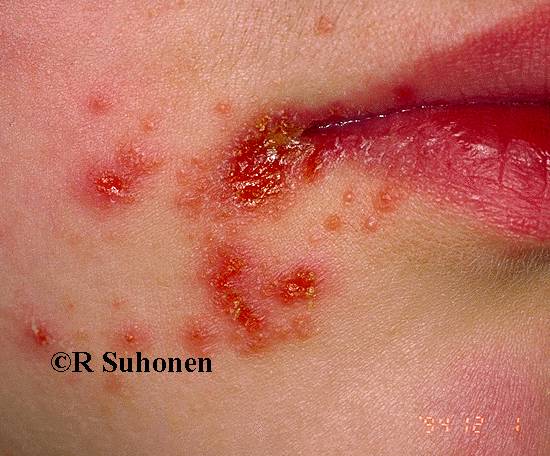 Impetigo contagiosa in the angle of the mouth.