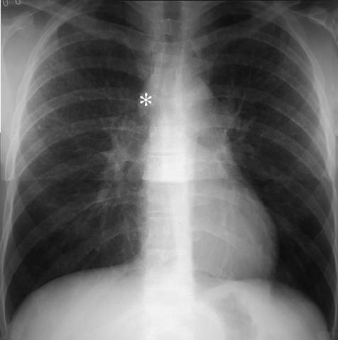 Sarcoidosis with enlarged lymph nodes in chest x-ray (PA view). Peripheral hilar lymph nodes are bilaterally enlarged. In addition, the azygos lymph node (*) is large. For lateral view, see Sarcoidosis with Enlarged Lymph Nodes in Chest x-Ray (Lateral View).
