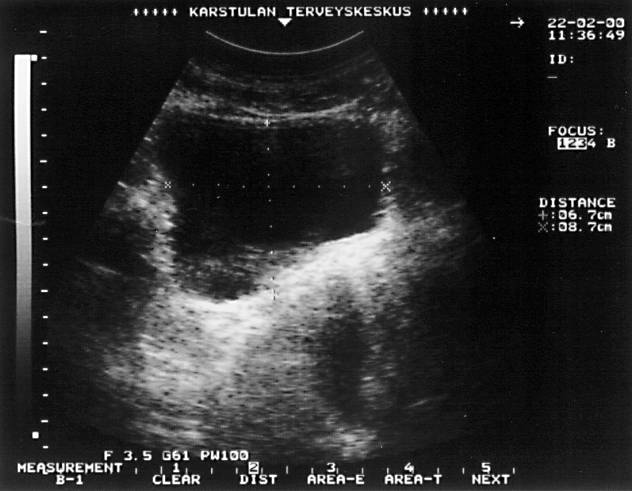 Urinary retention (transverse ultrasonographic picture). Urinary retention in an elderly man. The height of the urinary bladder measures 6.7 cm in a transverse ultrasonographic picture, the width measures 8.7 cm, and the length (in a longitudinal picture) measures 10.4 cm. The estimated minimum recidual urine volume is 0.6 × 10.4 × 6.7 × 8.7 = 364 ml.