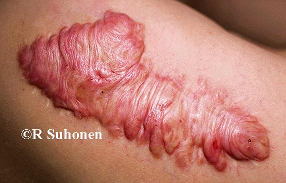 Keloid in a surgical scar in the should region. Widespread keloid in the shoulder region after surgery. In this case, pressure therapy with silicone gel sheeting might be beneficial. Simple excision would probably result in a still bigger keloid.