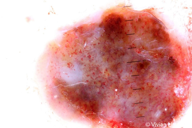 Melanoma. Dermatoscopic image. Breslow classification 2.1 mm. As most of the pigment in this lesion has disappeared, it looks almost like amelanotic melanoma. There is hardly any atypical pigment network in the lesion, but the malignant impression comes from the blue-white veil and atypical corkscrew vessels.