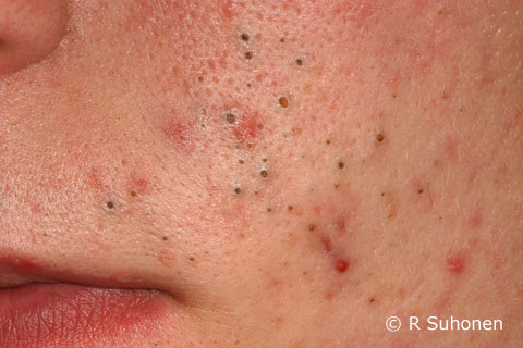Comedones in the cheek. Open comedones (blackheads) are in most cases seen in acne.