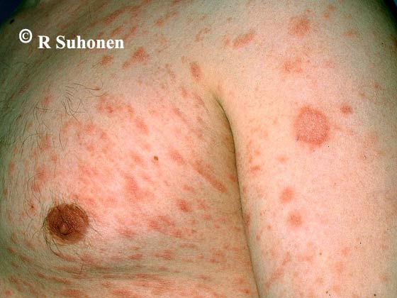 Pityriasis rosea. Pityriasis rosea is an exanthema most likely caused by a virus. The "herald patch" seen in the upper arm appeared a couple of weeks before the spread of the eruption. The herald patch with its collarette scaling may resemble ringworm of the body. The longer axis of the ellipsoid lesions on the trunk follows the direction of the ribs.