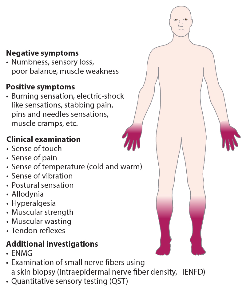 Summary of symptoms and findings for the diagnosis of diabetic neuropathy or painful diabetic neuropathy. The results must fit the criteria for diabetic neuropathy (e.g. symmetric occurrence and gradient from distal to proximal). Touch sensation is assessed with a 10 g monofilament, vibration sensation with a 128 Hz sound bar, pain/sharp sensation e.g. with a cut-off end of a wooden spatula cut in two, and heat and cold sensation with a standardised instrument (e.g. test tubes containing hot and cold water).