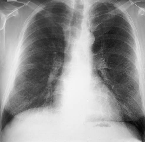 Sarcoidosis in chest x-ray. Chest x-ray shows small disseminated interstitial consolidations. The hilar lymph nodes are not (anymore) enlarged.