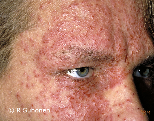 Eczema herpeticum: generalized herpes on the face. Eczema herpeticum (eruptio varicelliformis Kaposi) is a severe viral infection where Herpes Simplex virus starts to spread in the skin from a small recidive lesion, usually in the face and especially in people with atopic dermatitis.