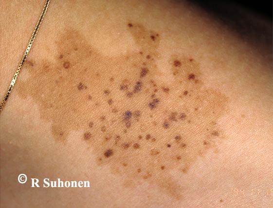 Naevus spilus. Naevus spilus or speckled lentiginous nevus is a benign brownish area with scattered darker spots. The clinical approach is similar to other benign naevi. Naevus spilus has only cosmetic significance.