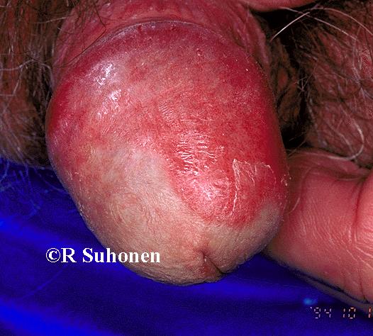 Seborrhoeic dermatitis on the penis. Seborrhoeic dermatitis is a common but greatly underdiagnosed ailment in the glans-preputium area. Differential diagnosis includes erythroplasia of Queyrat - Bowen's disease of the glans region - that can be identified with biopsy only. A patient with erythroplasia should be referred to a specialist for treatment.
