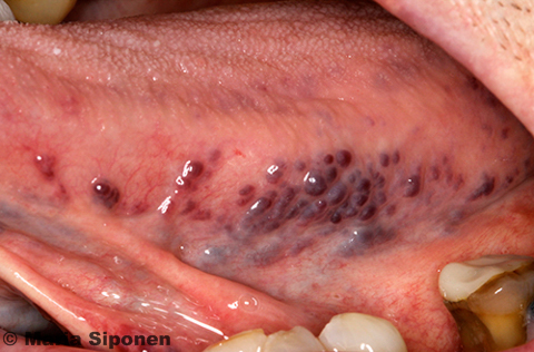 Lingual varices. Lingual varices are dark-coloured dilated superficial veins on the inferior or lateral surface of the tongue. The changes are innocent, and their incidence increases with age.