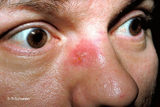 Herpes vesicle on the nose. The area innervated by the trigeminus nerve is one of the favourite sites of herpes infection.