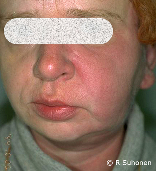 Erysipelas on the face. Erysipelas is rather common on the face. In this patient, the CRP and blood leucocyte levels were rapidly increased. The initial point of entry was a small break in the skin of the ear lobe.