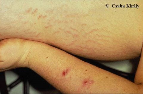 Stretch marks on the thigh. Stretch marks (striae distensae), i.e. tears in the dermal layer of the skin, on the thigh. In addition, folliculitic lesions are seen on the forearm caused by abuse of androgenic-anabolic steroids (non-sterile needles).