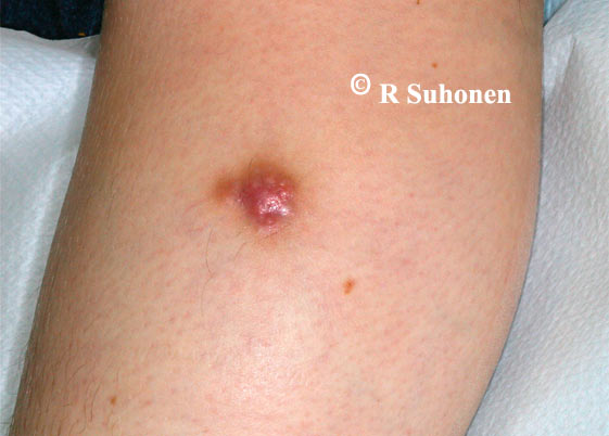 Dermatofibroma. An unusually large, reddish, multilocular dermatofibroma on the leg. The diffuse pigmentation around the outer margins is characteristic for this benignskin tumour. The diagnosis was confirmed with a biopsy.